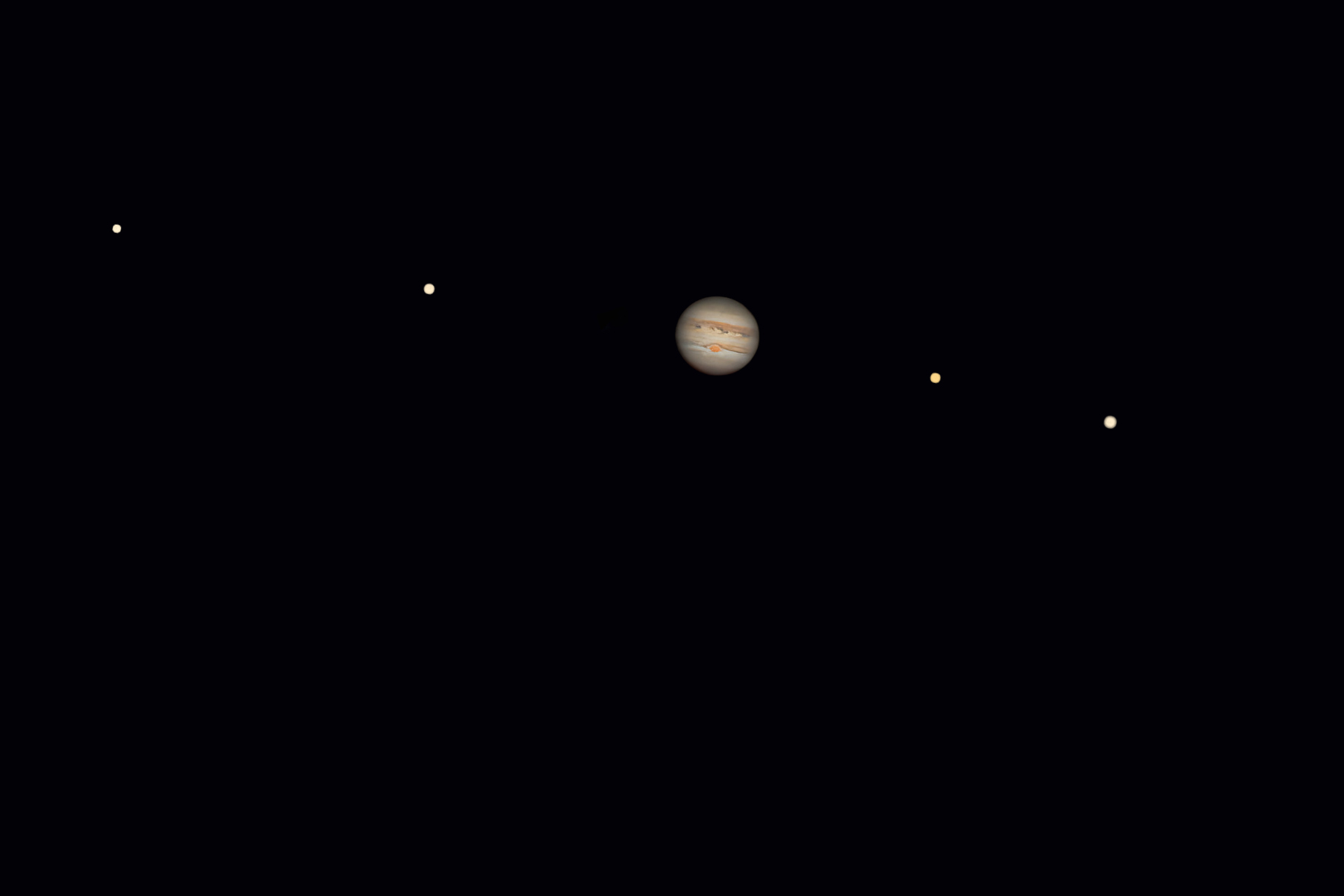 Mit Galileischen Monden Io, Europa, Ganymed und Kallisto. Entfernung zur Erde: Zwischen 588 Mio. km und 970 Mio. km.